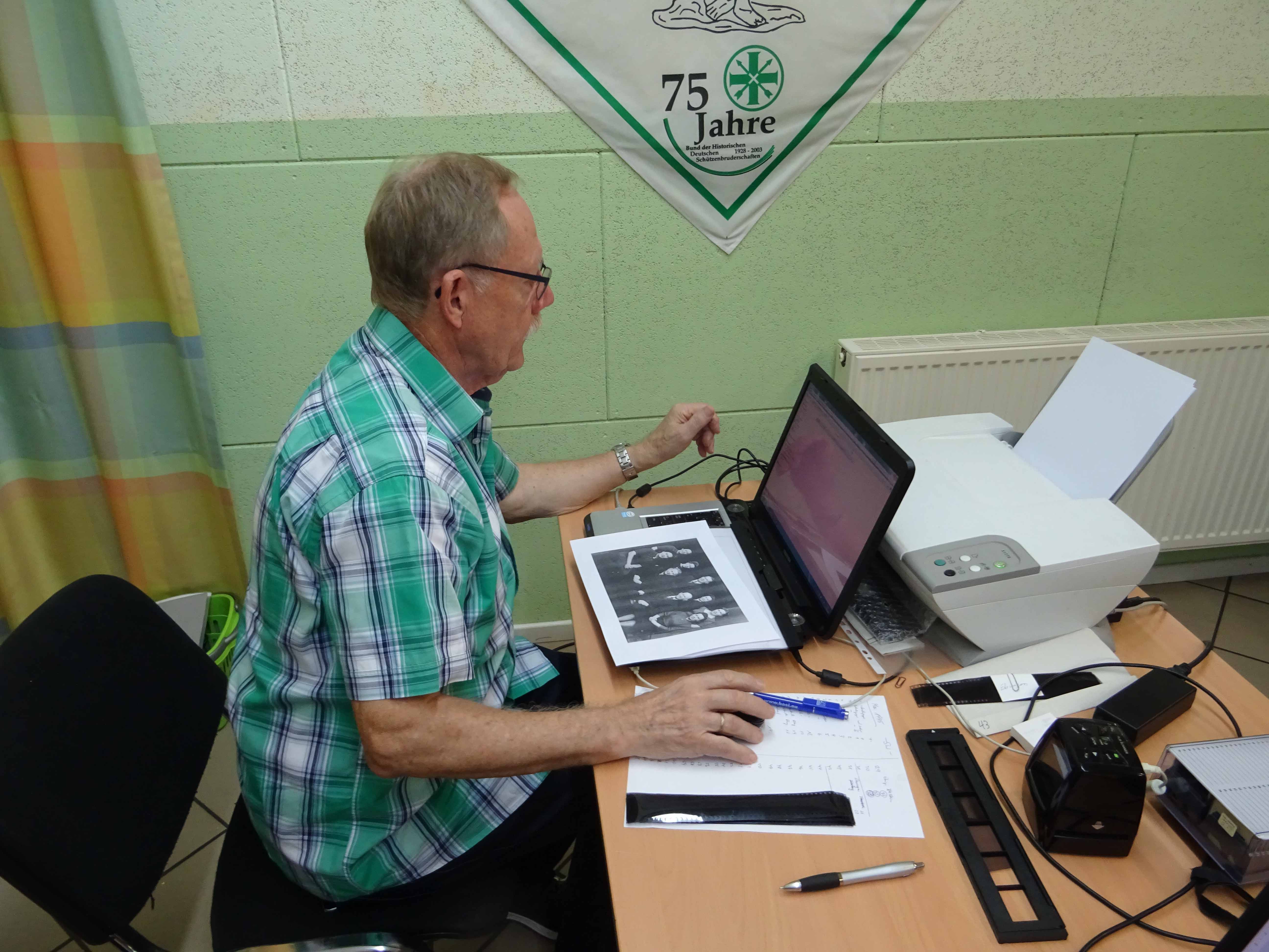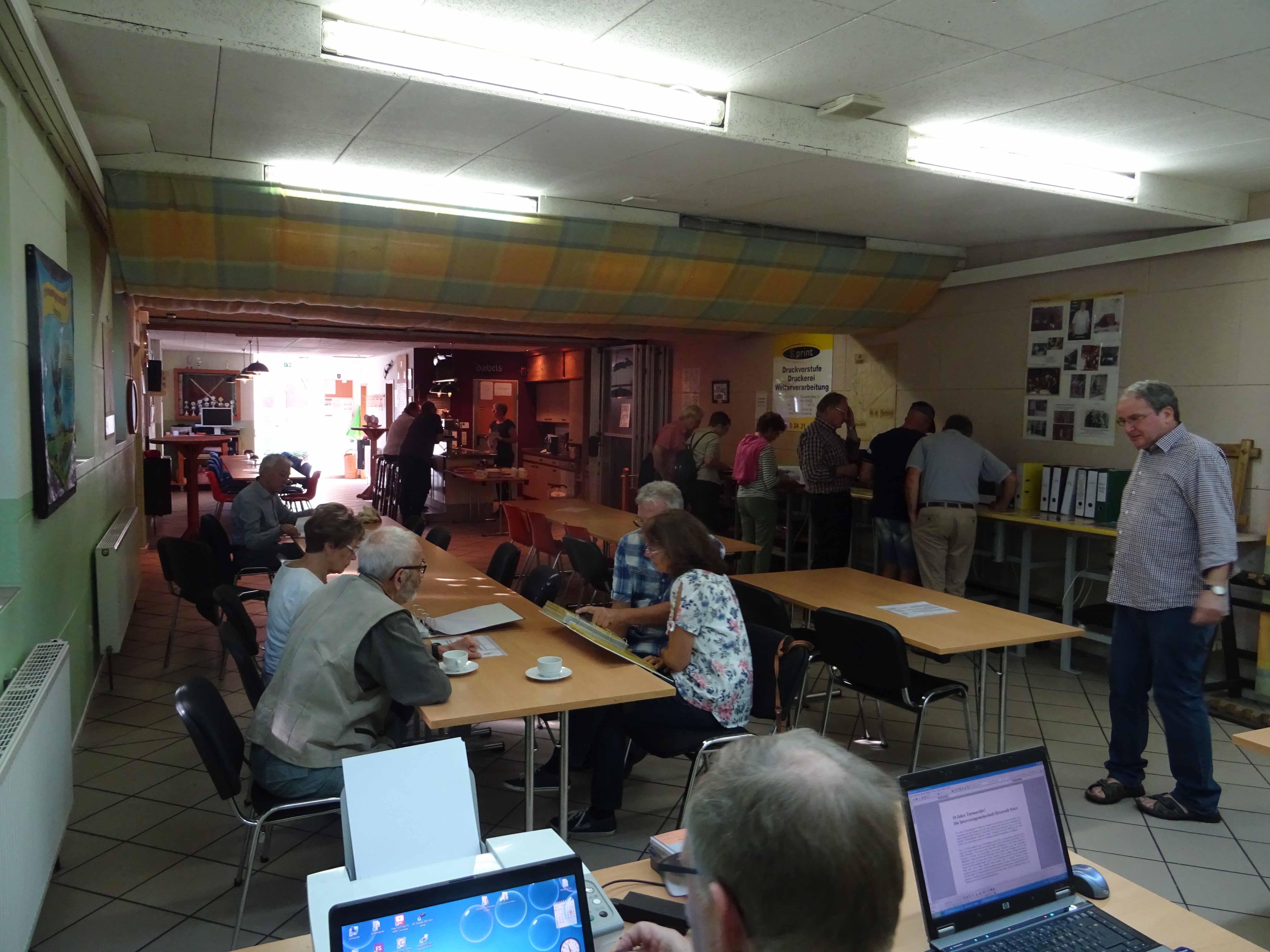Dass auch einige Gäste ihre alten Bilder an diesem Tag mitbrachten, hat uns natürlich besonders gefreut. Sie wurden sofort eingescannt, um sie zu erhalten und einige Namen der abgebildeten Personen zu notieren. Rainer Rogowski, der zweite Vorsitzende der IGH, hatte die entsprechende Technik dabei und „voll im Griff“. Wer wollte, konnte sich selbstverständlich auch das Hetzerather Turmarchiv ansehen. Heinz Willi Wyen war immer gerne bereit, diesen Wunsch zu erfüllen und pendelte öfters zwischen Schützenhalle und Turmarchiv hin und her. So verging der in doppelter Hinsicht „historische Tag“ wie im Flug. Zahlreiche Informationen konnten ausgetauscht werden und so manches „Hetzerather Mysterium“ wurde aufgeklärt, auch wenn es nur der Name eines längst verstorbenen Einwohners war.