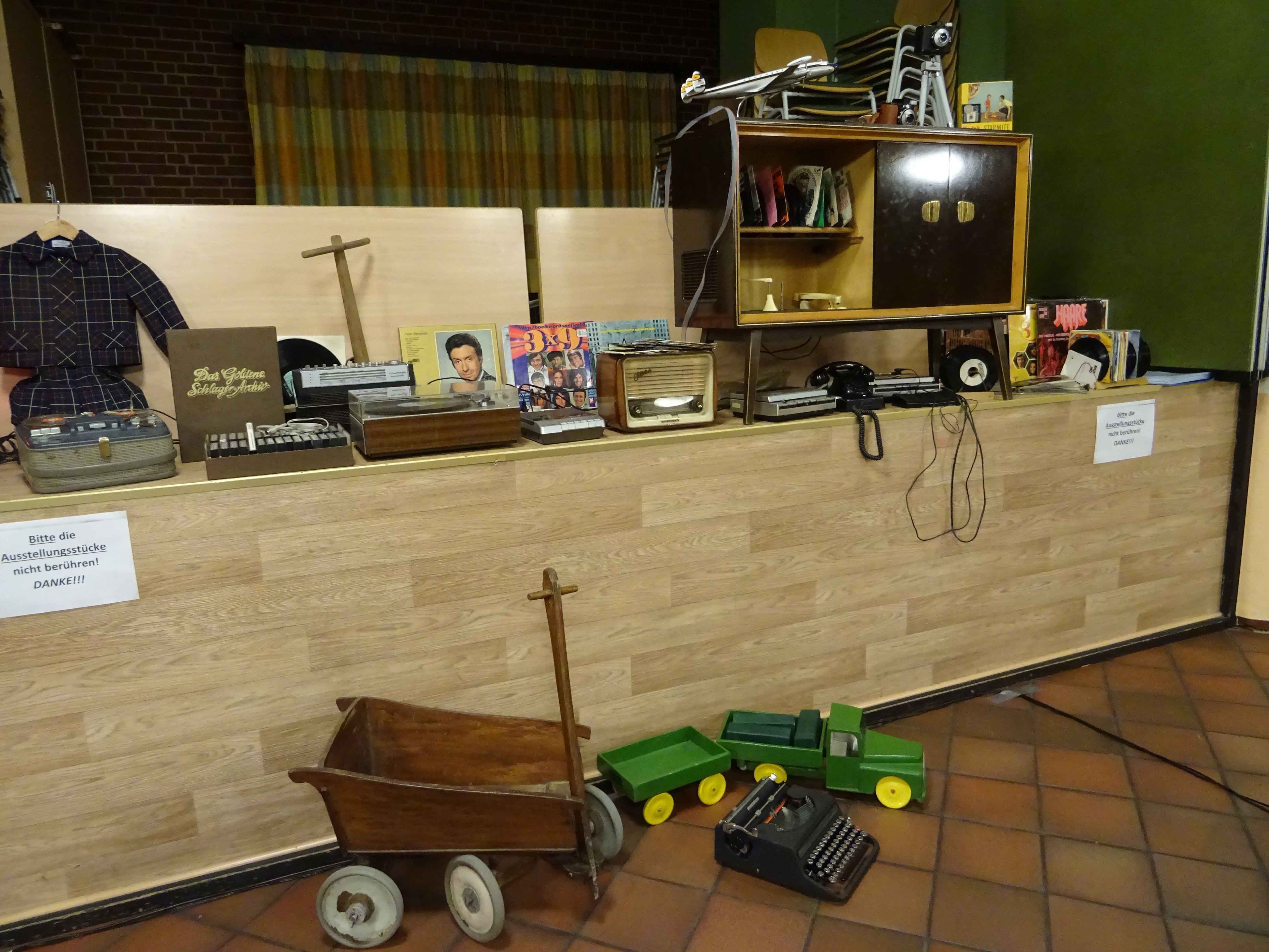 Auf und vor der Bühne hatte der Vorstand allerlei Dinge zusammengetragen, die damals noch zum alltäglichen Leben gehörten. Natürlich war dort der gute alte Plattenspieler, das Tonbandgerät oder ein altes Radio zu finden. Das Prunkstück der Sammlung war ein kompletter Musikschrank, ebenfalls mit Plattenspieler und Radio bestückt, den wir auf die Bühne „gehievt“ haben. Neben einem alten Diktiergerät fanden sich auch ein paar alte Kameras und eine Lavalampe ein. Auch wenn mangels Antenne der Empfang der Radios nicht perfekt war, waren trotzdem fast alle Geräte voll funktionsfähig. Ein alter Bollerwagen, ein Holz-Lkw und ein Holzroller waren vor 50 bis 60 Jahren noch in den Auslagen der Spielwarengeschäfte zu finden, heute gehören sie zur Dekoration, an der vielleicht so manche Kindheitserinnerung hängt. Auch ein eigens von Thomas John geholter Hula Hoop Reifen fand seinen Weg ins Jugendheim. Frisch gebügelte Kleidungsstücke, ein Modellflugzeug und eine große Sammlung an Singles und Langspielplatten verschiedenster Interpreten, zum Teil stilgerecht in den entsprechenden Plattenständern präsentiert, rundeten die Ausstellung im wahrsten Sinne des Wortes ab.