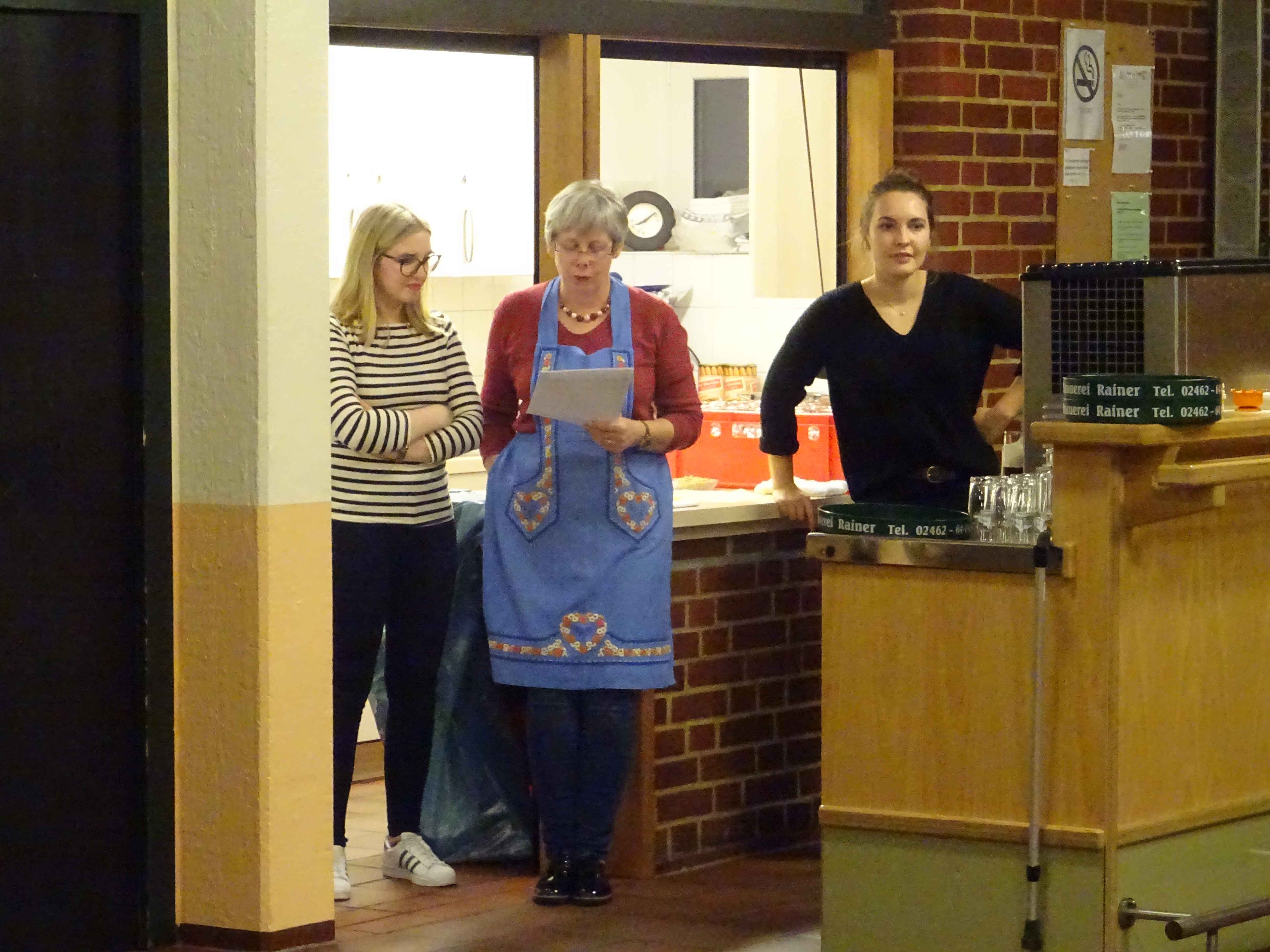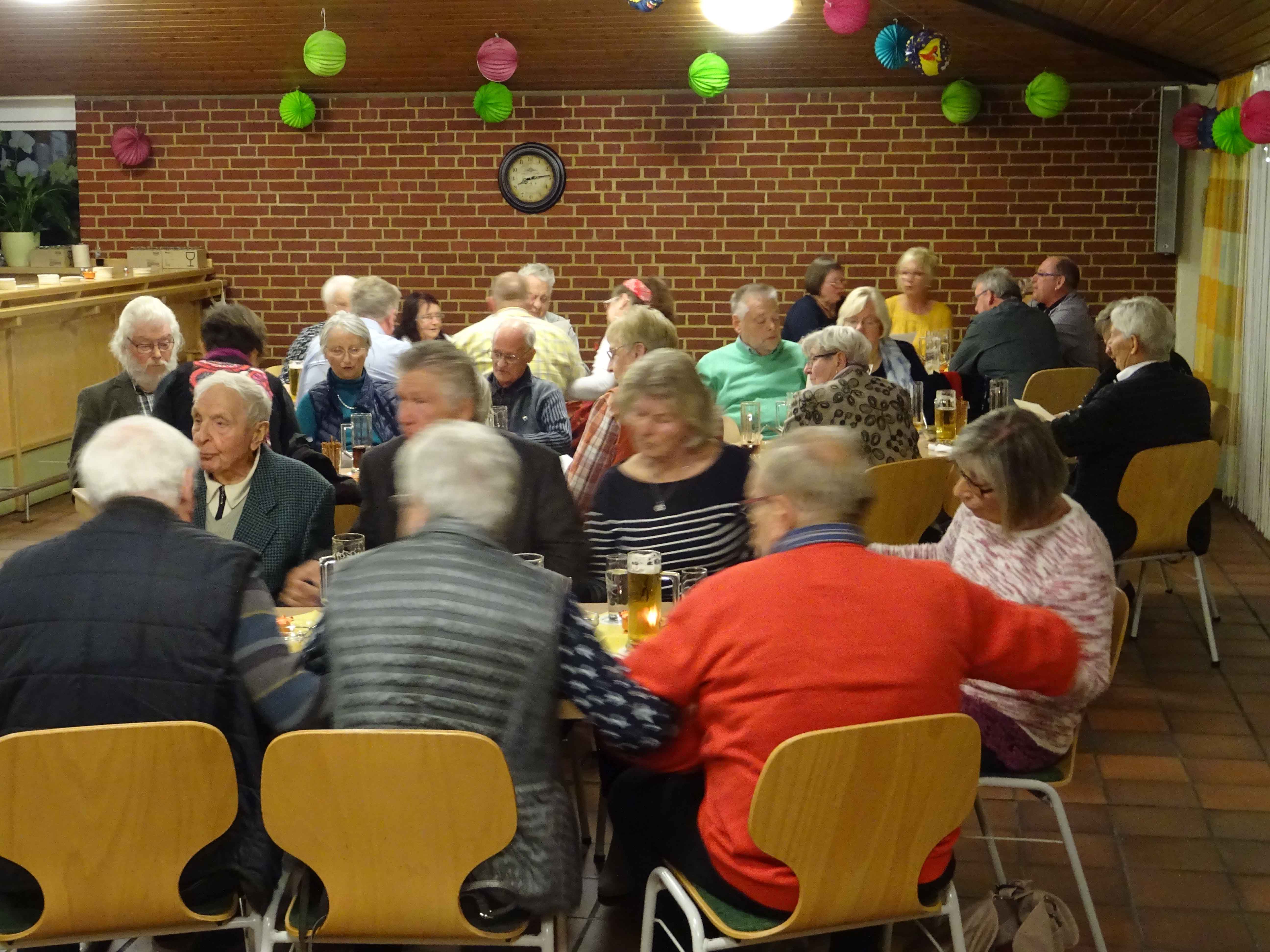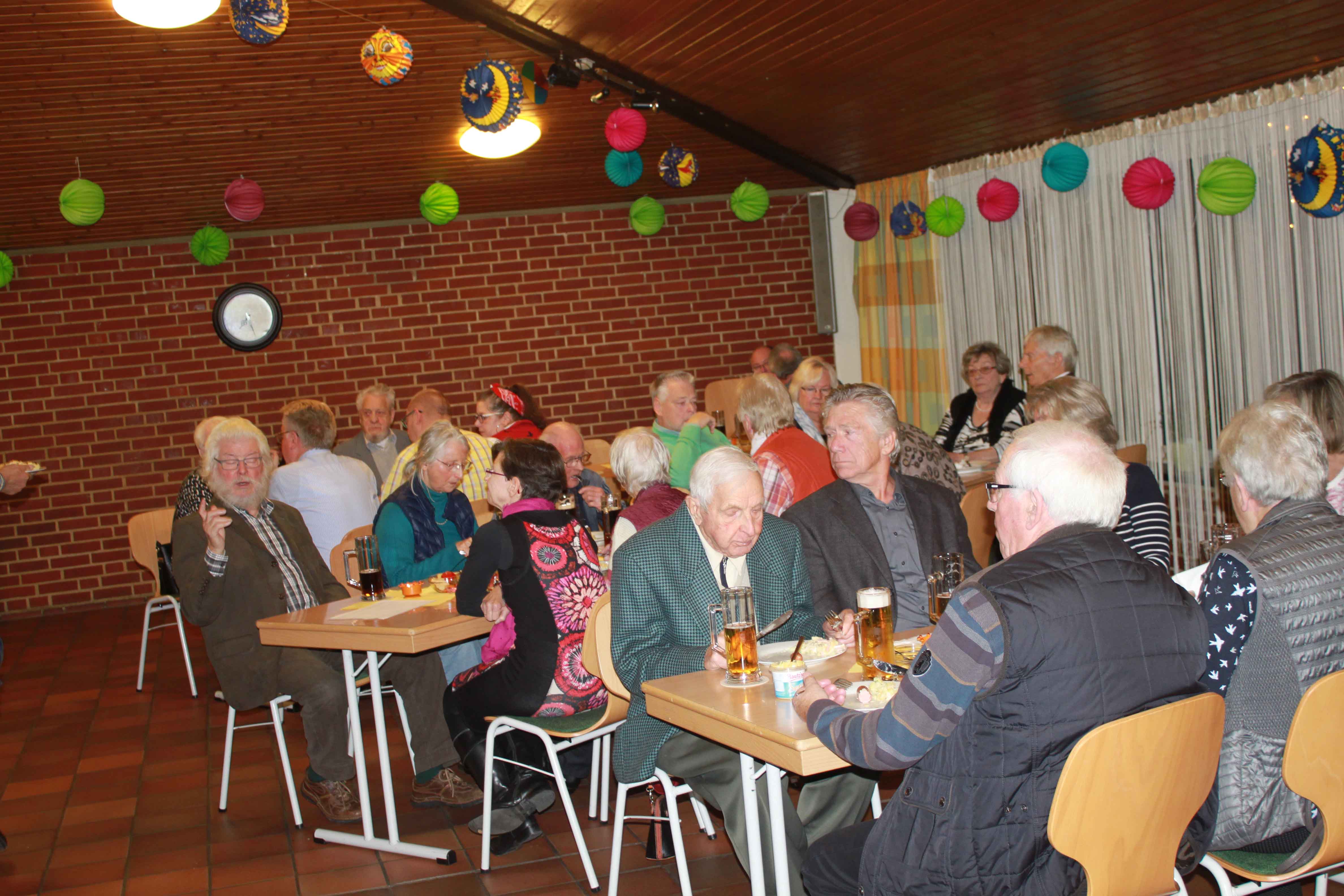 Nach dem guten Essen und der entsprechenden Stimmung kam es zum ersten Höhepunkt des Abends; wobei vielleicht war es für den einen oder anderen auch schon der zweite! Lambert Hensen aus Genhof, ein ehemaliger Lehrer, Musikus und geschichtlich Interessierter, trat mit seiner Gitarre auf, um mit der Gesellschaft zu singen und einige Anekdoten zu erzählen. Vieles auf Platt, wobei wir alle vorher gründlich in diese „Sprache“ eingewiesen wurden. Entsprechende Liedertexte hatte ich bereits im Vorfeld kopiert, so dass jeder mitsingen konnte, was viele auch taten, ein wenig zu meiner persönlichen Verwunderung! Die neue Musikanlage im Jugendheim hatte Rainer Rogowski „voll im Griff“. Auch wenn sie viel kleiner ist wie die alte, funktionierte sie einwandfrei und tat gute Dienste; bei Lambert Hensen und den weiteren Programmpunkten.