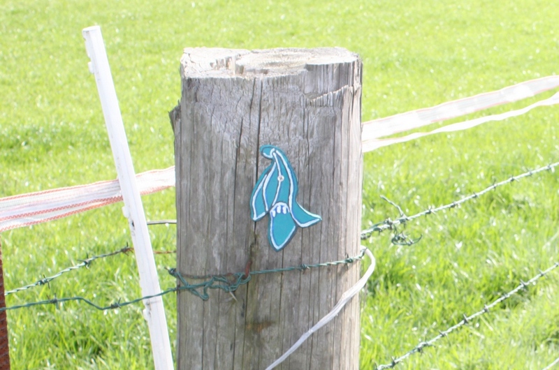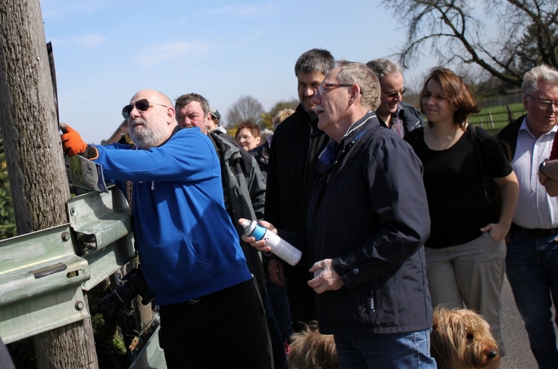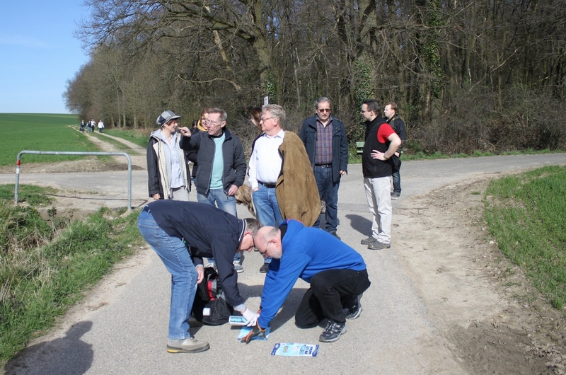 Doch zurück zur Geschichte. Schnell noch die Frage an Rainer Rogowski, ob er alles dabei hat was wir benötigen. Mit einem kurzen „ja, natürlich" wurde ich beruhigt. Schließlich war es unsere Aufgabe, die Strecke zu markieren. Das Symbol dafür war eine stilisierte Hyacinthoides, besser bekannt als „Hasenglöckchen". Dort wollten wir ja hin, in den Wald zwischen Baal und Hückelhoven. Heinz Willi hatte im Vorfeld einige aus Holz gebastelt und ich eine derartige Schablone angefertigt. An neuralgischen Punkten der Wegstrecke, also Wegkreuzungen oder Einmündungen, wollten wir hölzerne Blumen zur Markierung festschrauben. Dafür benötigten wir jedoch das Einverständnis der Besitzer. Das bekamen wir z. B. von Gerd Schmalen, der mit der Verschönerung eines seiner Zaunpfähle seiner Pferdewiese kein Problem hatte. Auch am Propeller vor meinem Haus hängt ein solches Exemplar; wurde ich früher öfters auf selbigen angesprochen, liegt jetzt das Interesse mehr an der Holzblume, welche den Haltemasten ziert! Weniger flexibel in Sachen der Wegmarkierungen zeigten sich leider die Städte Erkelenz und Hückelhoven, über deren Gebiet die Wanderstrecke verläuft. Eine dauerhafte Markierung wurde uns nicht gestattet! Also besorgte Rainer Kreidefarbe in Druckdosen. Zuerst schön kräftig wird sie im Laufe von Wochen oder Monaten immer mehr ausgewaschen, bis hin zur Unkenntlichkeit. Aber, sehen wir es positiv: so haben wir immer mal wieder einen Grund, die Strecke gemeinsam abzulaufen. Jede derartige Markierung wurde, im Gegensatz zur unspektakulären Befestigung der Holzblumen, mit lustigen Kommentaren begleitet. Am Ende der Wanderung war der Unterschied zwischen uns und einem Schlumpf nur noch marginal! Jetzt habe ich soviel über das „schmückende Beiwerk" geschrieben, aber welche Strecke wanderte die gutgelaunte Gesellschaft eigentlich?