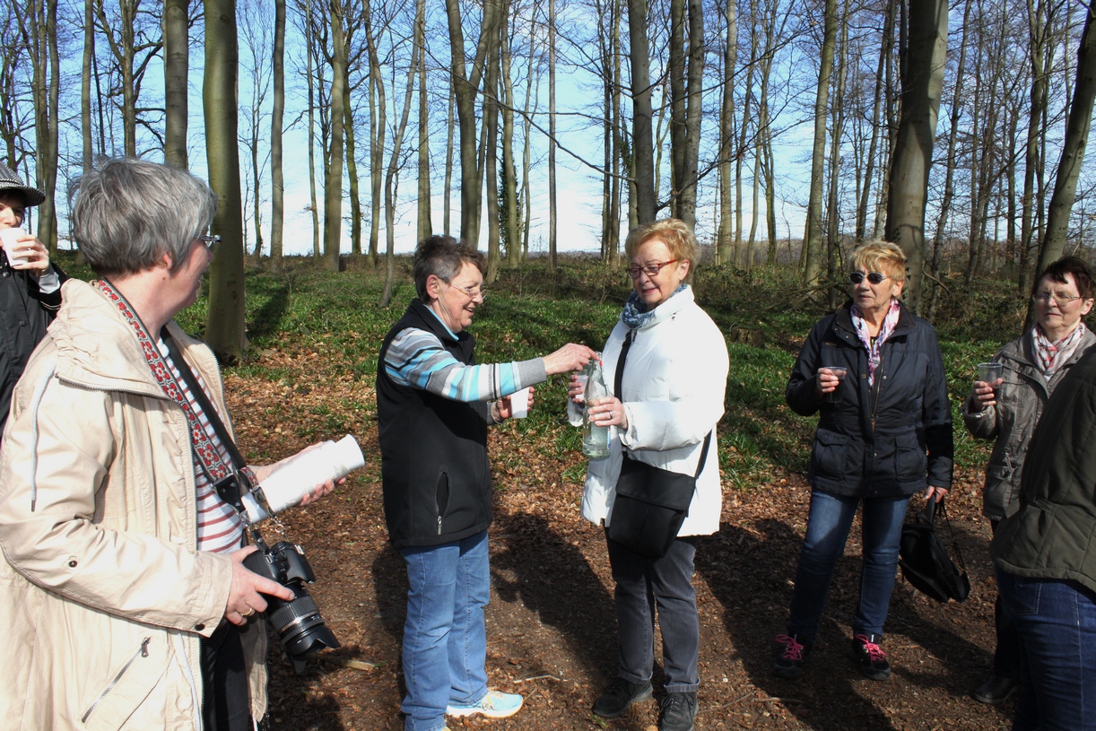 Von der Kirche ging es durch die Jan-Karsken-Straße und entlang der Rurtalstraße links herab in das Tal des Granterather Fließ. Immer geradeaus in Richtung Baal. Diesen Weg verlassen wir erst, wenn wir an eine Waldkante kommen nach rechts in Richtung der Verbindungsstraße Baal/Hückelhofen. Kurz vor Ende dieses Weges, links sieht man ein Wegeskreuz, geht es rechts, leicht bergauf, zum Wald der blauen Blumen. Aufgrund der frühen Jahreszeit waren die Blüten jedoch noch nicht auf, die normale Blütezeit liegt im April/Mai. Hier im Wald machten wir dann auch eine kurze Pause.