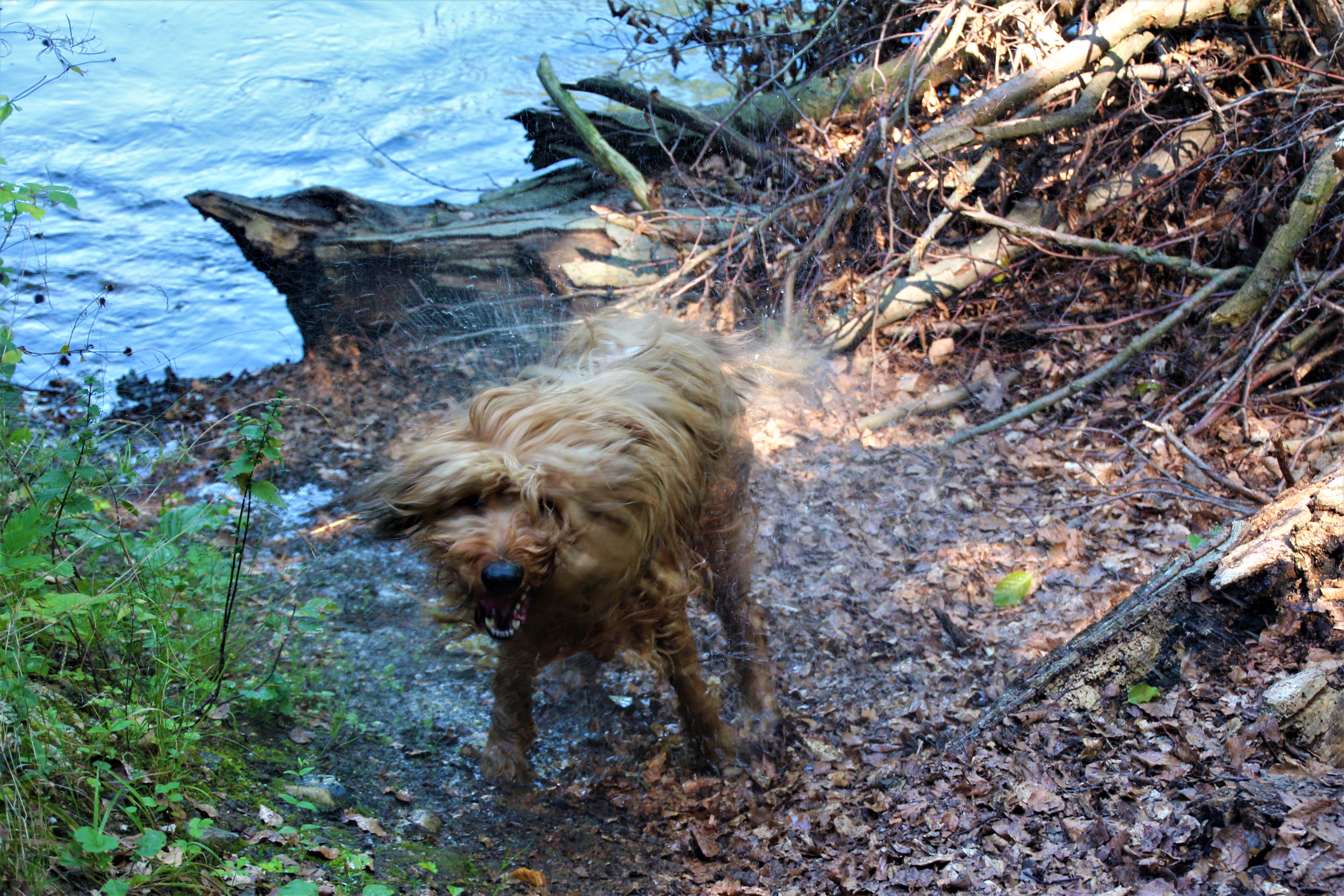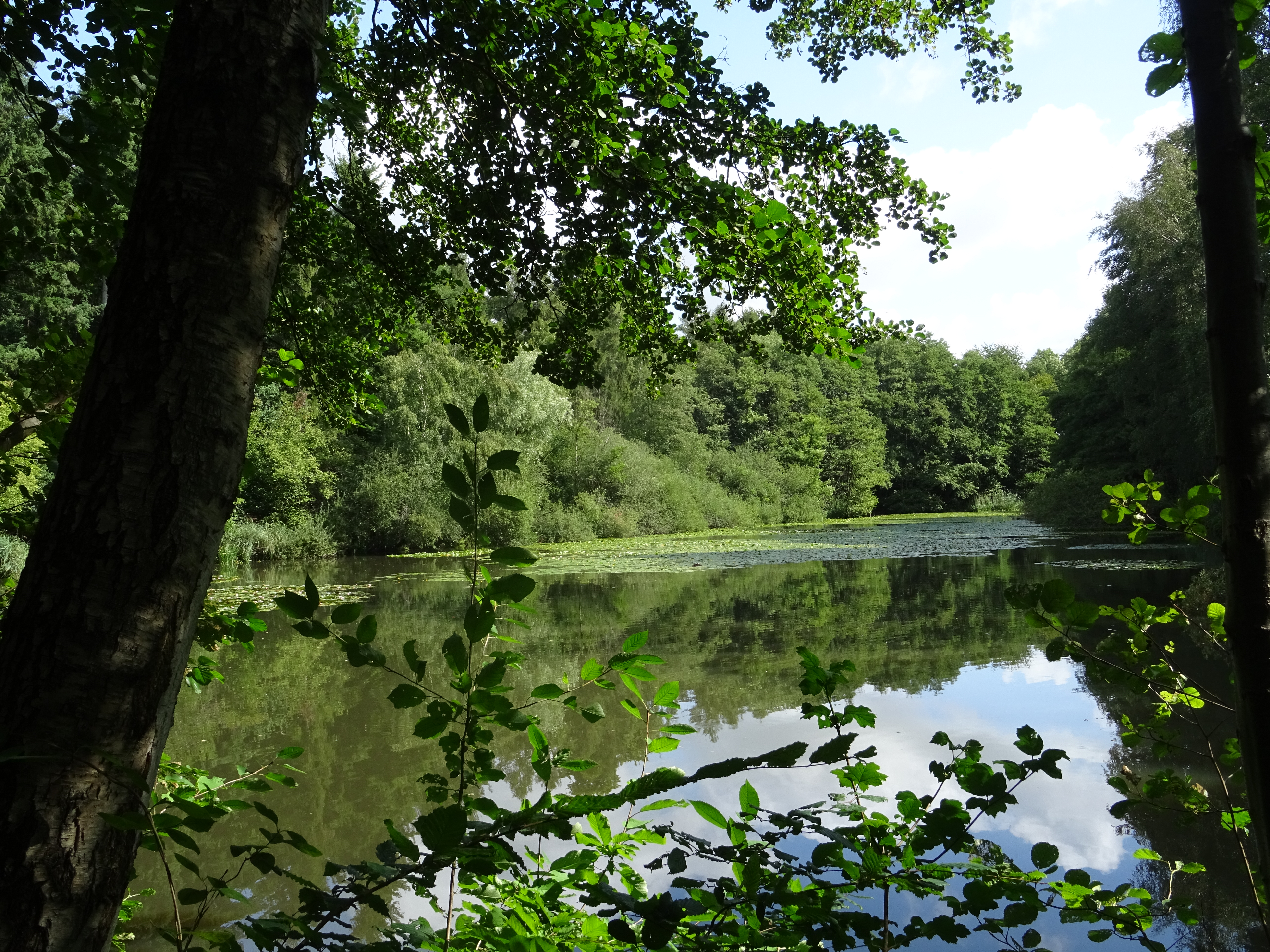 Rechts Wald, links Felder und darüber hinweg mit Weitblick bis in die Voreifel, wurde Hetzerath immer kleiner. Genau gegenüber unseres Heimatorts ging es herab in den Wald. Das geübte Wanderer Auge erkennt rechts des Weges einen alten Schießstand aus Kriegszeiten. Die nächste Möglichkeit wieder nach rechts abgebogen, geht es nun direkt auf den Kühler Weiher drauf zu. Nach einer leichten Anhöhe ist das Gewässer schon zu sehen. Doch eigentlich wurden wir schon vorher über das Erreichen des kleinen Waldsees „informiert“: Garlic, der mit uns wandernde Hund, hatte sich bereits erfrischt und kam uns pitschnass entgegen.