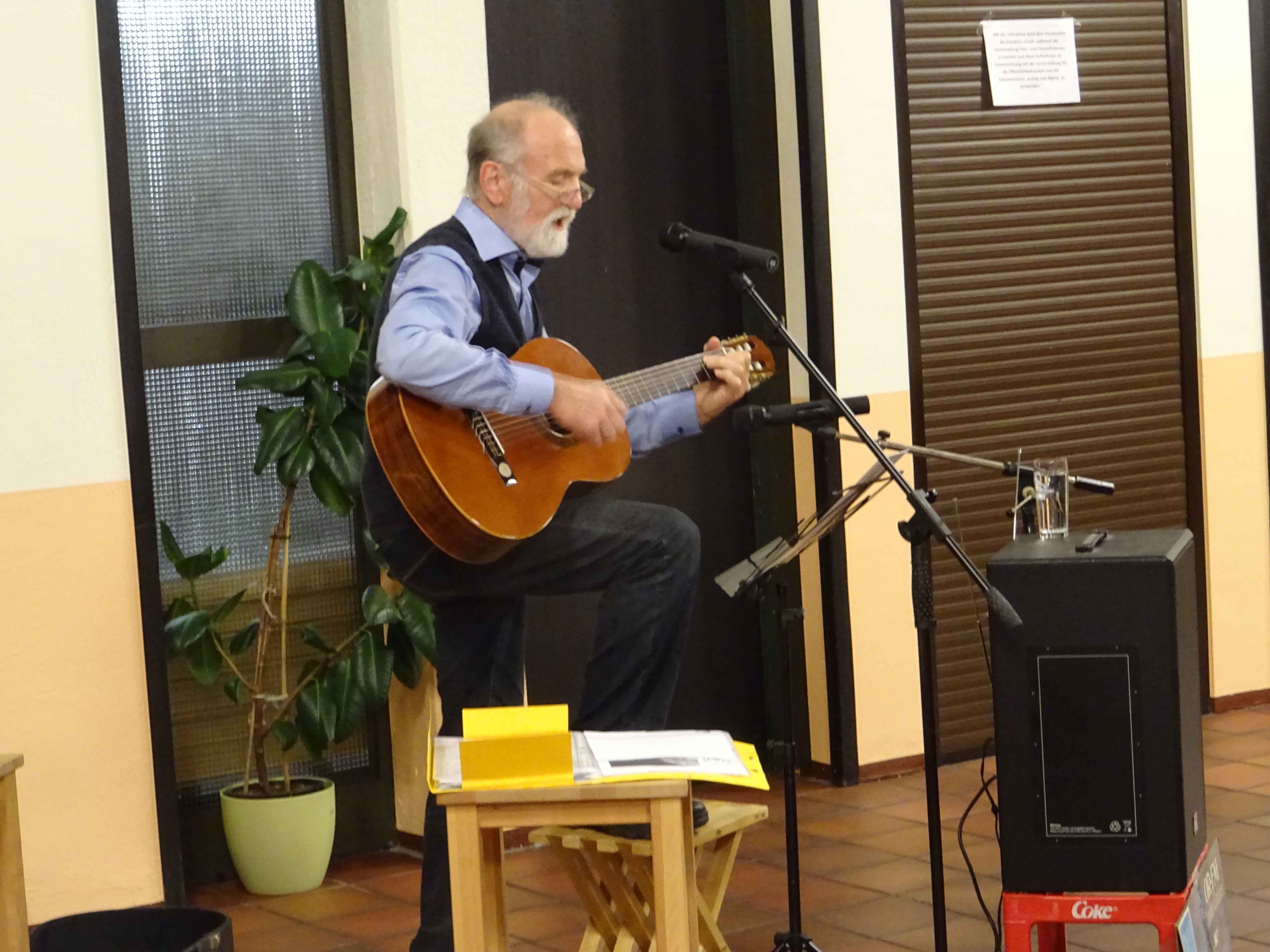 Nach dem guten Essen und der entsprechenden Stimmung kam es zum ersten Höhepunkt des Abends; wobei vielleicht war es für den einen oder anderen auch schon der zweite! Lambert Hensen aus Genhof, ein ehemaliger Lehrer, Musikus und geschichtlich Interessierter, trat mit seiner Gitarre auf, um mit der Gesellschaft zu singen und einige Anekdoten zu erzählen. Vieles auf Platt, wobei wir alle vorher gründlich in diese „Sprache“ eingewiesen wurden. Entsprechende Liedertexte hatte ich bereits im Vorfeld kopiert, so dass jeder mitsingen konnte, was viele auch taten, ein wenig zu meiner persönlichen Verwunderung! Die neue Musikanlage im Jugendheim hatte Rainer Rogowski „voll im Griff“. Auch wenn sie viel kleiner ist wie die alte, funktionierte sie einwandfrei und tat gute Dienste; bei Lambert Hensen und den weiteren Programmpunkten.