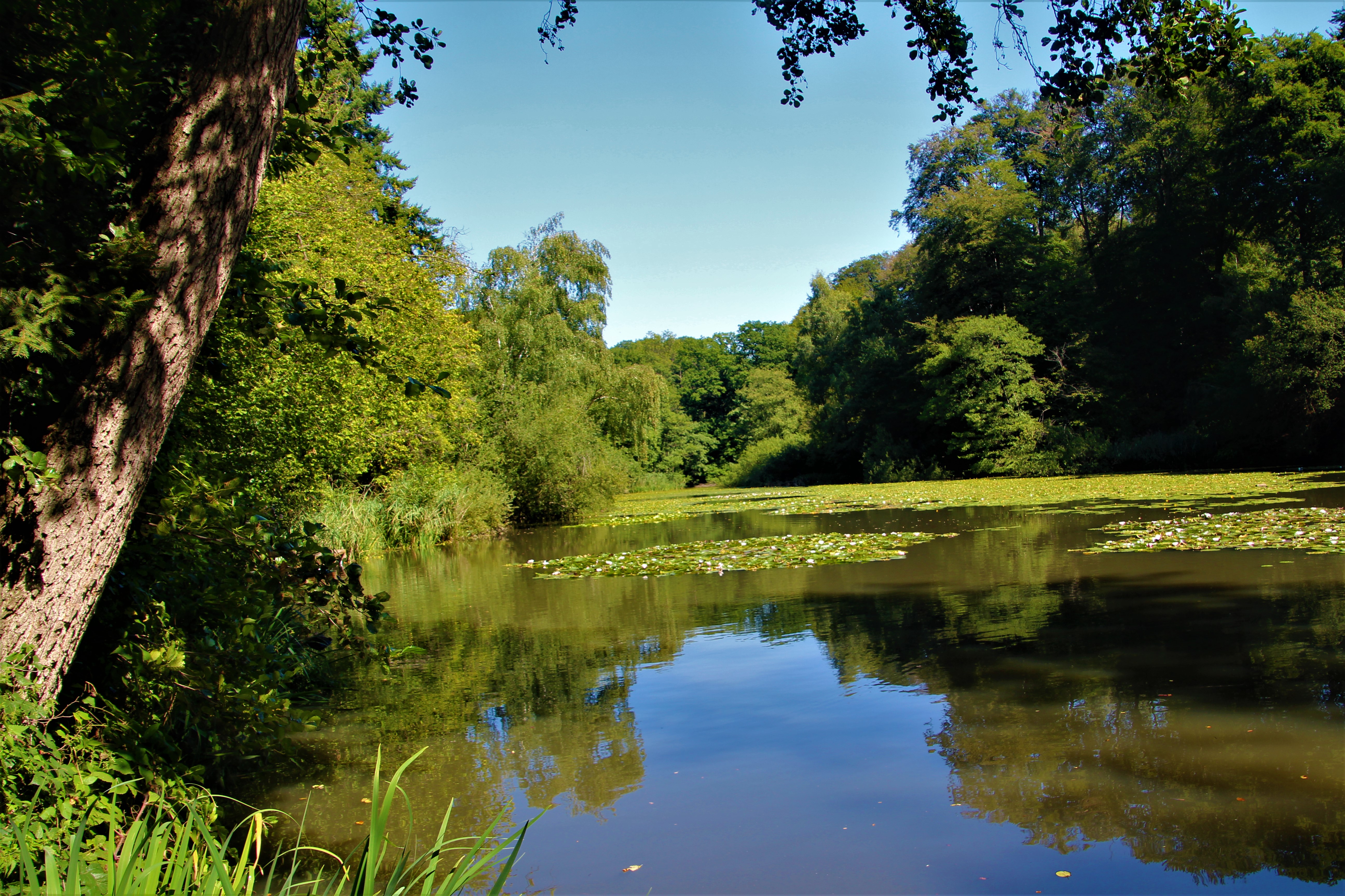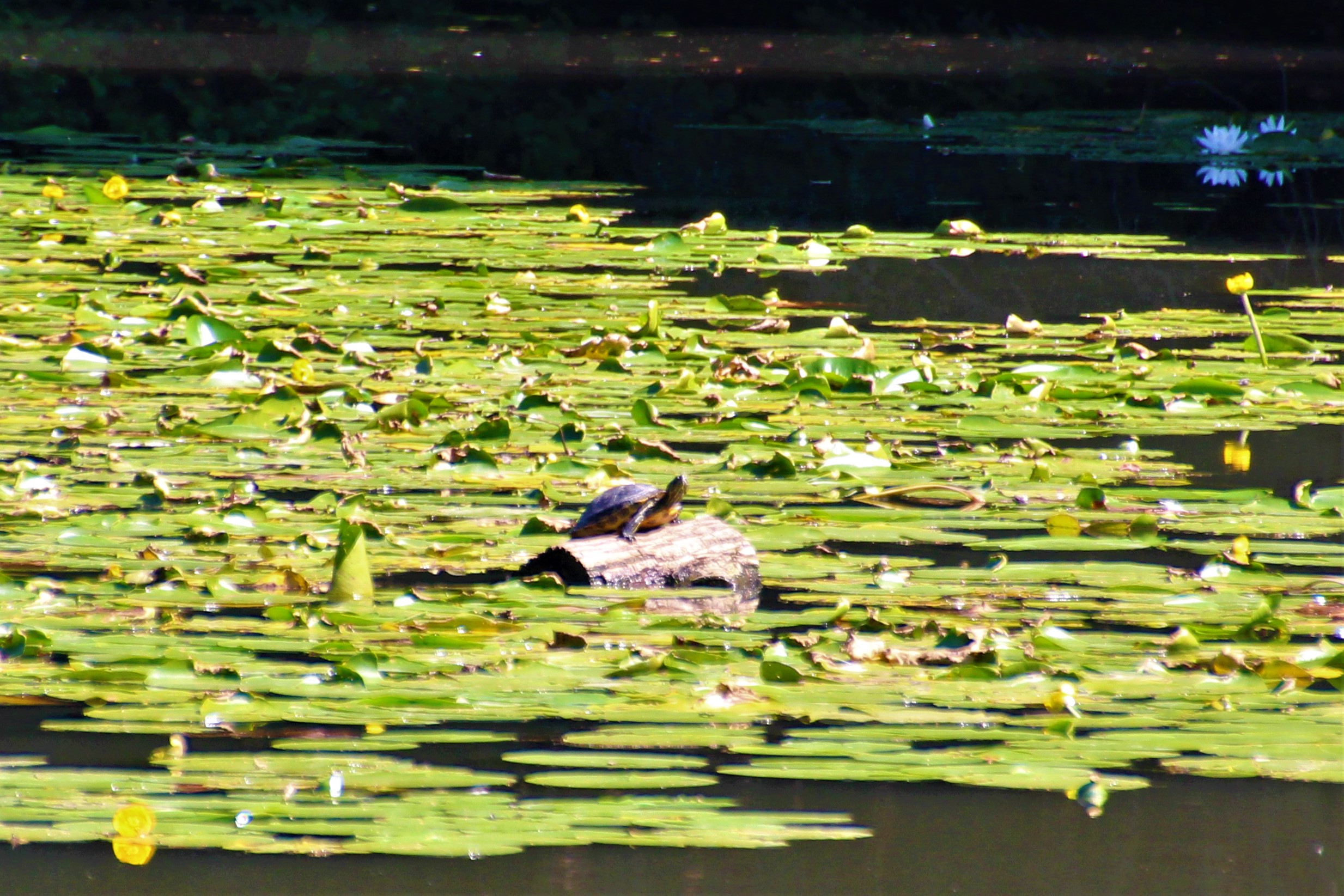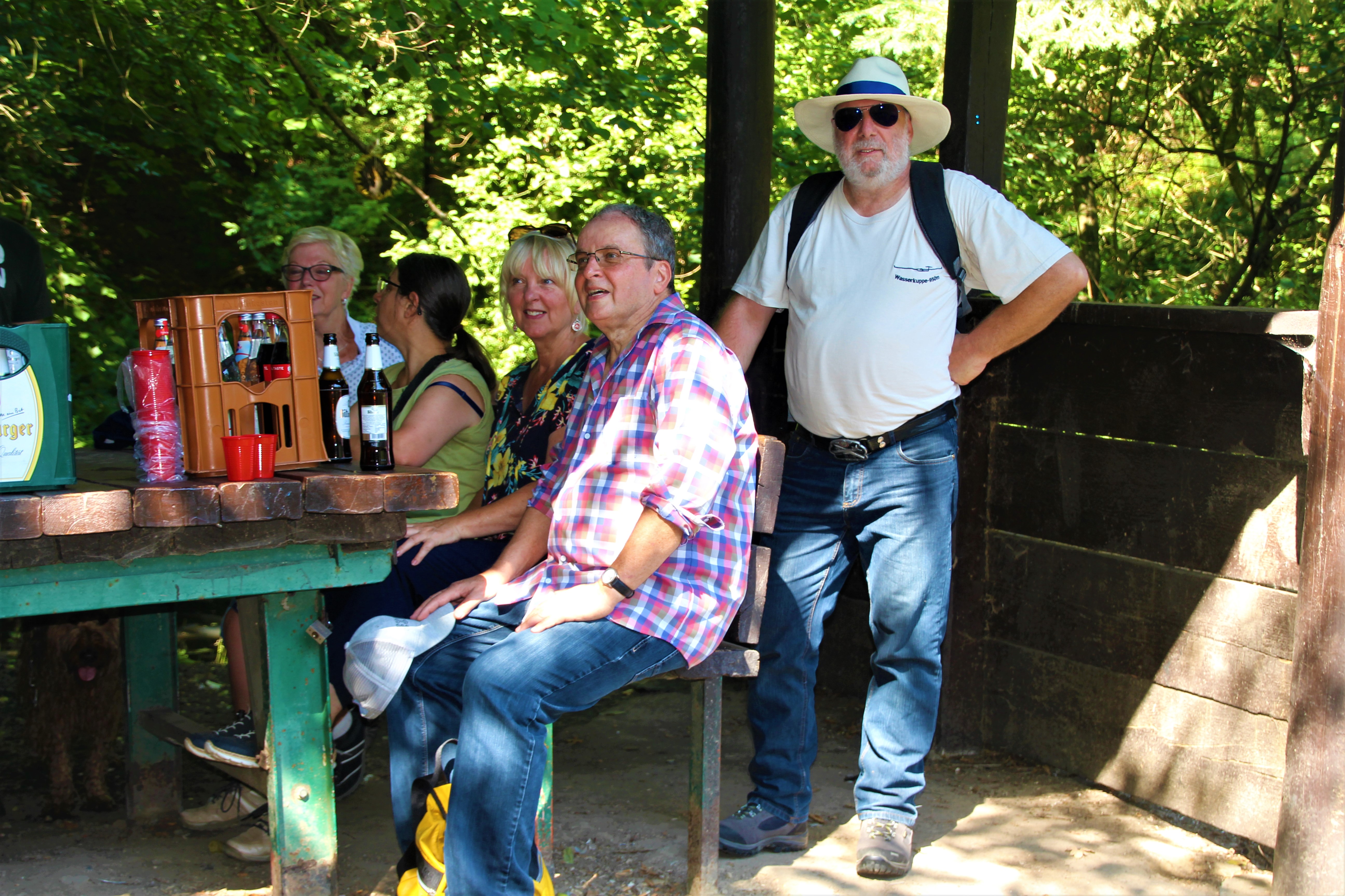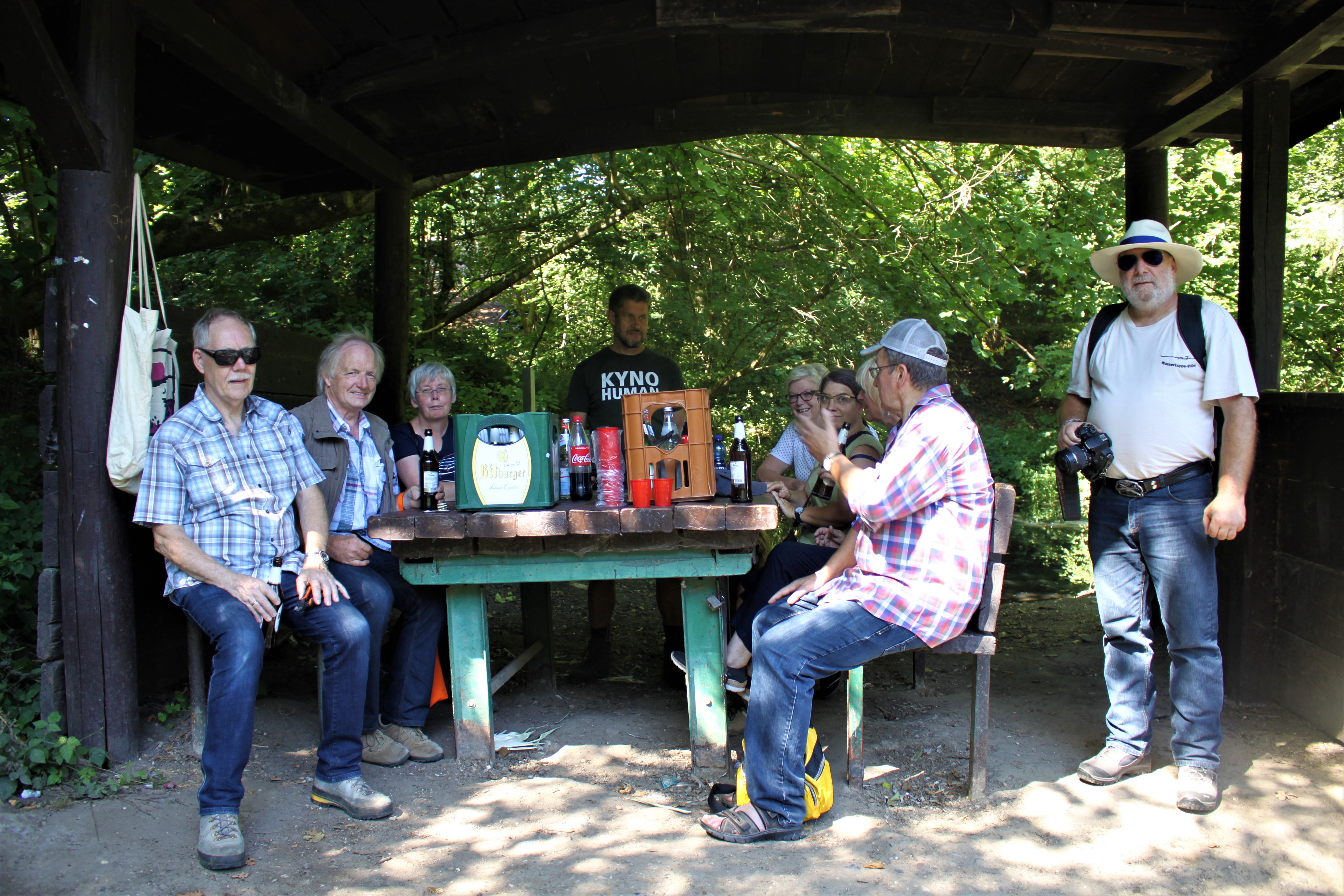 Am Westufer gingen wir entlang des Wassers, um dann an der folgenden Grillhütte ein wenig auszuruhen. Der Vorsitzende der Interessengemeinschaft Hetzerath (IGH) Heinz Willy Wyen, hatte dort im Vorfeld zur Freude der Wanderer Getränke deponiert, bei diesen recht hohen Temperaturen eine willkommene Erfrischung für alle, außer für Garlic, der immer wieder ins Wasser sprang. Die Pause tat allen gut, angeregte Gespräche entwickelten sich im Schatten unter dem Dach der Hütte. Wildenten kamen zu uns, um etwas Essen zu erhaschen. Selbst eine Schildkröte war auf einem im Wasser treibenden Ast, zwischen den zahlreichen Seerosen zu entdecken. Vorbei am Kühler Hof ging es erfrischt und guter Dinge wieder zurück in Richtung Hetzerath.