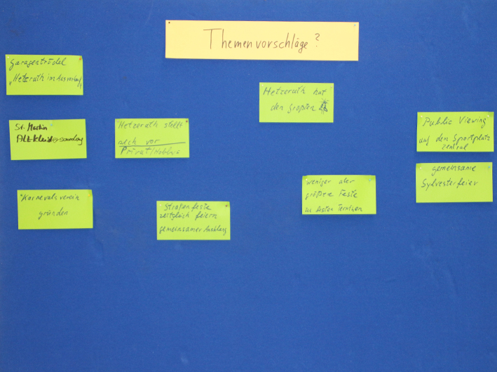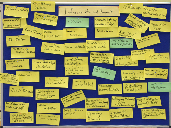 Unter dem Motto „Unser Dorf gemeinsam gestalten" sind alle Hetzerather und Hetzeratherinnen eingeladen, die Zukunft unseres Dorfes mit zu gestalten. Alle sind willkommen, ihren Phantasien freien Lauf zu lassen, sich kreativ einzubringen und ihre Wünsche, Ideen, Träume, Visionen mit anderen zu teilen. Wir gehen damit in unserem Dorf neue Wege!