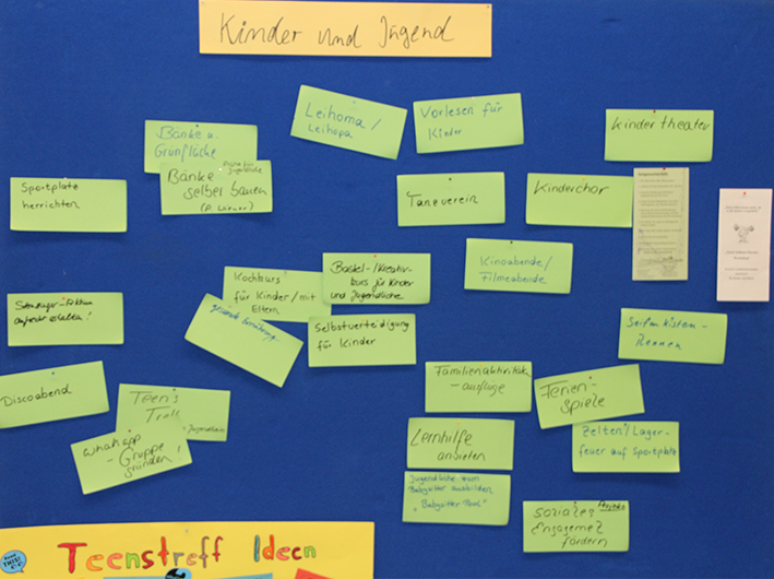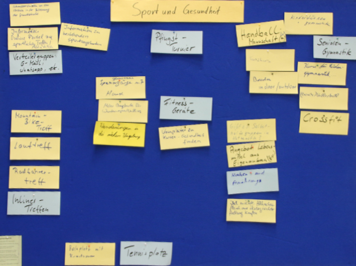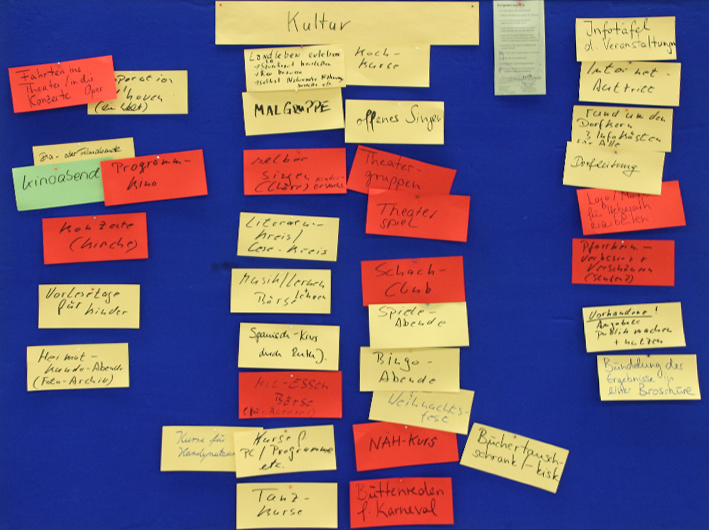 Diese waren von der Resonanz sowie den zahlreichen kreativen Vorschlägen aller Beteiligten beeindruckt. Bis zum Ende der Veranstaltung wurden fast 200 Ideen und Visionen auf Karten von allen Akteuren eingebracht! Ein ganz tolles Ergebnis, das die Potentiale in unserem Dorf mehr als eindrucksvoll zeigt. Die Ideen wurden im Anschluß in zahlreichen weiteren Themenabenden mit den Moderatoren und interessierten Bürgern diskutiert und es wurden konkrete Vorschläge zur Umsetzung entwickelt. Hierzu haben sich zahlreiche Akteure bereit erklärt, ihre Themen als sogenannte Themenpaten eigeninitiativ voran zu bringen. Die gesammelten Ergebnisse dazu können unter diesem Link eingesehen werden. Die unterschiedlichsten Themen und Projekte werden derzeit angegangen und umgesetzt. Erste Erfolge konnten bereits am 16. September 2017 der Bürgerschaft in der Mehrzweckhalle vorgestellt werden.